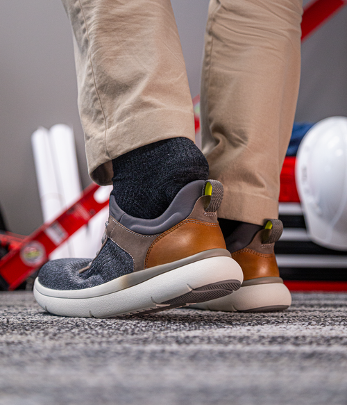 Easy On. Tough at Work. The Fleet Work Men's Gray and Brown Composite Toe Elastic Work Sneaker is built for those who demand protection and expect comfort. Designed for the toughest jobs, this safety toe series features SupaStep heel technology and elastic no-tie laces for effortless hands-free entry. With built-in Flexsole technology, you get instant, all-day comfort right out the box.